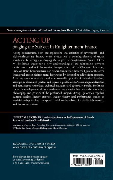 Acting Up argues for the importance of theatrical acting to the development of modern subjectivity in Enlightenment France. Leichman weaves together literary studies, cultural studies, and performance studies, looking at the ways in which esthetic treatises, dramatic texts, religious tracts, theories of acting, political polemics, and philosophical writings consistently figure the actor and the art of portraying a character on stage as the era’s most promising, and problematic, model of selfhood.