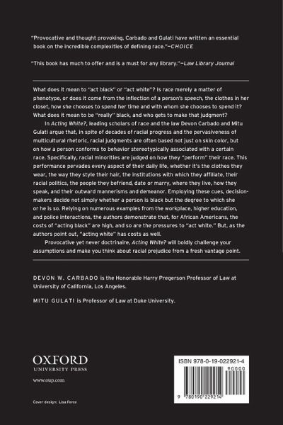 In Acting White, two of America's leading scholars of race and the law, Devon Carbado and Mitu Gulati, argue that that racial judgments are based not just on phenotypic skin color differences but on performative differences-how a person conforms to behavior stereotypically associated with a certain race.