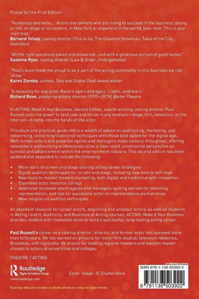 In Acting: Make It Your Business Second Edition, award-winning casting director Paul Russell offers a wealth of advice on auditioning, marketing, and networking, and puts the power to land jobs and thrive in any medium â stage, film, TV, or the Internet â directly into the hands of the actor.