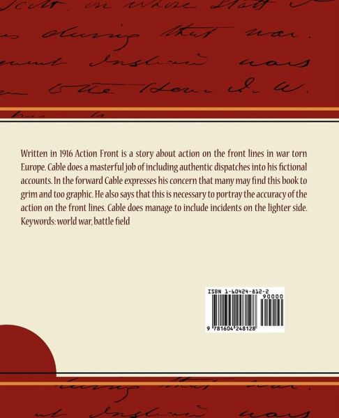 Written in 1916 Action Front is a story about action on the front lines in war torn Europe. Cable does a masterful job of including authentic dispatches into his fictional accounts. In the forward Cable expresses his concern that many may find this book to grim and too graphic. He also says that this is necessary to portray the accuracy of the action on the front lines. Cable does manage to include incidents on the lighter side. Keywords: world war, battle field