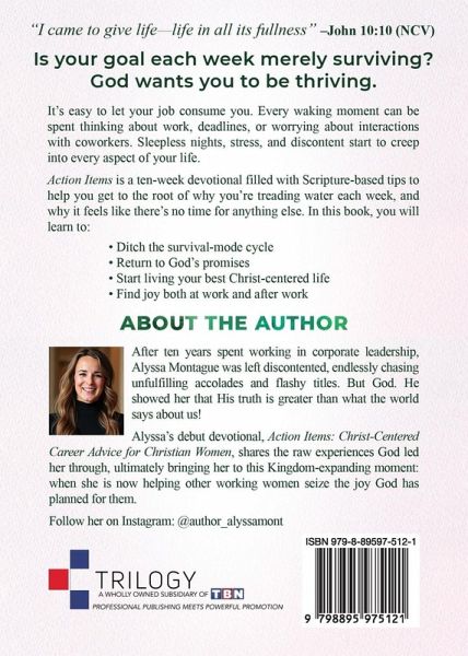 "I came to give life -- life in all its fullness" -John 10:10 (NCV) Is your goal each week merely surviving? God wants you to be thriving. It's easy to let your job consume you. Every waking moment can be spent thinking about work, deadlines, or worrying about interactions with coworkers. Sleepless nights, stress, and discontent start to creep into every aspect of your life. Action Items is a ten-week devotional filled with Scripture-based tips to help you get to the root of why you're treading water each week, and why it feels like there's no time for anything else. In this book, you will learn to: ¿Ditch the survival-mode cycle ¿Return to God's promises ¿Start living your best Christ-centered life ¿Find joy both at work and after work