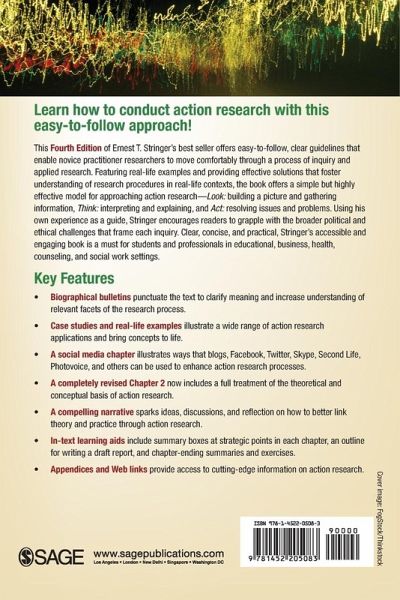 The Fourth Edition of Ernest T. Stringer s best-selling Action Research offers easy-to-follow, clear guidelines that enable novice practitioner researchers to move comfortably through a process of inquiry and applied research. Featuring real-life examples and providing effective solutions that foster understanding of research procedures in real-life contexts, the book offers a simple but highly effective model for approaching action research: Look: building a picture and gathering information, Think: interpreting and explaining, and Act: resolving issues and problems. Using his own experience as a guide, Stringer encourages readers to grapple with the broader political and ethical challenges that frame each inquiry. The author s engaging style makes the book especially relevant to those working with children, young adults, or people in community contexts, and is particularly relevant to those dealing with issues of diversity or with marginalized and disenfranchised groups. Clear, concise, and practical, Stringer s accessible and engaging book is a must for students and professionals in educational, business, health, counseling, and social work settings.