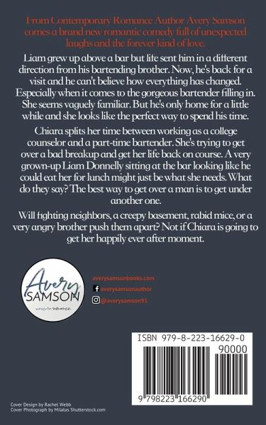 From Contemporary Romance Author Avery Samson comes a brand new romantic comedy full of unexpected laughs and the forever kind of love. Liam grew up above a bar but life sent him in a different direction from his bartending brother. Now, he's back for a visit and he can't believe how everything has changed. Especially when it comes to the gorgeous bartender filling in. She seems vaguely familiar. But he's only home for a little while and she looks like the perfect way to spend his time. Chiara splits her time between working as a college counselor and a part-time bartender. She's trying to get over a bad breakup and get her life back on course. A very grown-up Liam Donnelly sitting at the bar looking like he could eat her for lunch might just be what she needs. What do they say? The best way to get over a man is to get under another one. Will fighting neighbors, a creepy basement, rabid mice, or a very angry brother push them apart? Not if Chiara is going to get her happily ever after moment.