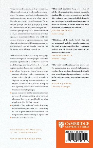 "Using the unifying notion of group actions, this second course in modern algebra introduces the deeper algebraic tools needed to get into topics only hinted at in a first course, like the successful classification of finite simple groups and how groups play a role in the solutions of polynomial equations. Because groups may act as permutations of a set, as linear transformations on a vector space, or as automorphisms of a field, the deeper structure of a group may emerge from these viewpoints, two different groups can be distinguished, or a polynomial equation can be shown to be solvable by radicals. By developing the properties of these group actions, readers encounter essential algebra topics like the Sylow theorems and their applications, Galois theory, and representation theory. Warmup chapters that review and build on the first course and active learning modules help students transition to a deeper understanding of ideas"--
