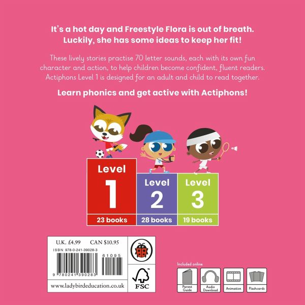 Learn phonics and get active with Actiphons!Actiphons is an energetic phonics series for children who are learning to read. These lively stories practise 70 letter sounds in the order they are taught in school - each with its own fun character and action. By reading the stories in order, children will build their phonics skills and become active, lifelong readers!Every book contains a unique code which unlocks a collection of free online resources, including a song, audiobook and animation for each story. Visit the Ladybird Education website and use the Get Set! reading check to find the perfect Actiphons book for every child. It's a hot day and Freestyle Flora is out of breath. Luckily, she has some ideas to keep her fit!Freestyle Flora is Book 19 of 23 in Actiphons Level 1, and is designed for an adult and child to read together. This story is also available as part of Actiphons Level 1 Box 2.