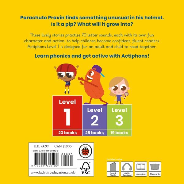 Learn phonics and get active with Actiphons!Actiphons is an energetic phonics series for children who are learning to read. These lively stories practise 70 letter sounds in the order they are taught in school - each with its own fun character and action. By reading the stories in order, children will build their phonics skills and become active, lifelong readers!Every book contains a unique code which unlocks a collection of free online resources, including a song, audiobook and animation for each story. Visit the Ladybird Education website and use the Get Set! reading check to find the perfect Actiphons book for every child. Parachute Pravin finds something unusual in his helmet. Is it a pip? What will it grow into?Parachute Pravin is Book 4 of 23 in Actiphons Level 1, and is designed for an adult and child to read together. This story is also available as part of Actiphons Level 1 Box 1.