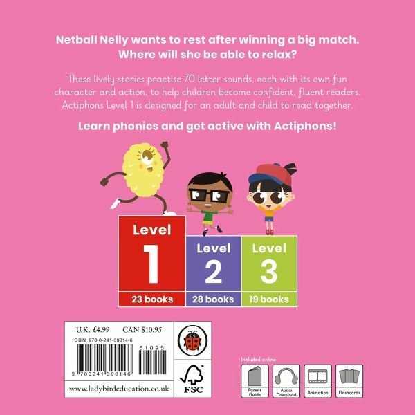 Learn phonics and get active with Actiphons!Actiphons is an energetic phonics series for children who are learning to read. These lively stories practise 70 letter sounds in the order they are taught in school - each with its own fun character and action. By reading the stories in order, children will build their phonics skills and become active, lifelong readers!Every book contains a unique code which unlocks a collection of free online resources, including a song, audiobook and animation for each story. Visit the Ladybird Education website and use the Get Set! reading check to find the perfect Actiphons book for every child. Netball Nelly wants to rest after winning a big match. Where will she be able to relax?Netball Nelly is Book 6 of 23 in Actiphons Level 1, and is designed for an adult and child to read together. This story is also available as part of Actiphons Level 1 Box 1.