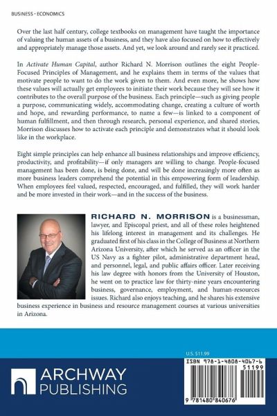 Over the last half century, college textbooks on management have taught the importance of valuing the human assets of a business, and they have also focused on how to effectively and appropriately manage those assets. And yet, we look around and rarely see it practiced. In Activate Human Capital, author Richard N. Morrison outlines the eight People-Focused Principles of Management, and he explains them in terms of the values that motivate people to want to do the work given to them. And even more, he shows how these values will actually get employees to initiate their work because they will see how it contributes to the overall purpose of the business. Each principle-such as giving people a purpose, communicating widely, accommodating change, creating a culture of worth and hope, and rewarding performance, to name a few-is linked to a component of human fulfillment, and then through research, personal experience, and shared stories, Morrison discusses how to activate each principle and demonstrates what it should look like in the workplace. Eight simple principles can help enhance all business relationships and improve efficiency, productivity, and profitability-if only managers are willing to change. People-focused management has been done, is being done, and will be done increasingly more often as more business leaders comprehend the potential in this empowering form of leadership. When employees feel valued, respected, encouraged, and fulfilled, they will work harder and be more invested in their work-and in the success of the business.