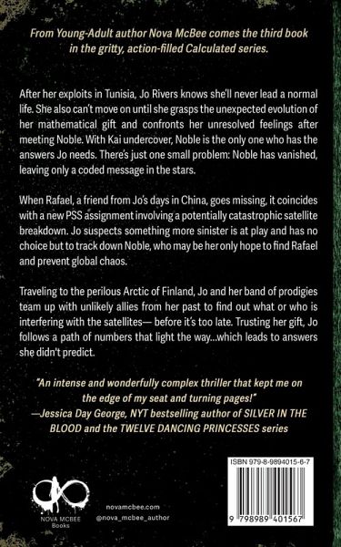 Immerse yourself in the thrilling world of survival and international intrigue with this third installment in the action-packed teen & young adult Calculated series. In this exhilarating sequel, Jo Rivers, grapples with the aftermath of her adventures in Tunisia. Haunted by her extraordinary mathematical abilities and the enigmatic encounter with Noble, Jo's quest for a normal life is forever shattered. As she embarks on a mission to unlock the secrets of her gift and confront her unresolved emotions, she discovers that Noble has inexplicably disappeared, leaving only a coded message in the stars. With Kai undercover, Noble is the only one who has the answers Jo needs. When Jo's old friend Rafael mysteriously vanishes, coinciding with a critical assignment involving a potentially catastrophic satellite malfunction, Jo's instincts tell her that something far more dangerous is afoot. Determined to find Noble and save Rafael, Jo finds herself plunging into the treacherous Arctic of Finland, accompanied by her exceptional comrades and unexpected allies from her past. Together, they must unravel the intricate web of interference plaguing the satellites, racing against time to avert global chaos. As she follows the path illuminated by the enigmatic digits, Jo uncovers unforeseen answers that will challenge everything she thought she knew. Delve into the adrenaline-fueled world of Nova McBee's Calculated series-a high-stakes YA saga brimming with betrayal, revenge, and the electrifying dance of numbers. Don't miss this thrilling addition to the survival stories and international thrillers genres that will leave you captivated from start to finish.