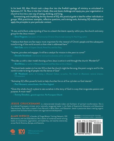 In 5Q, Alan Hirsch took a deep dive into the fivefold typology of ministry as articulated in Ephesians 4:1-16. Now in this User's Guide, Alan and Jessie challenge and equip you, your organization or church to live into a new way of seeing, thinking, and living. Summarizing and simplifying the key themes of 5Q, this practical guide is ideal for either individuals or groups. With practitioner examples, reflective questions, and training tools, Activating 5Q enables you to apply the principles to your particular context. "A new and brilliant understanding of how to unleash the latent capacity within you, the church and every group for the Jesus mission."—Dave Ferguson, lead pastor of Community Christian Church; lead visionary for NewThing; author "I believe that there are few topics more important for the renewal of Christ’s people and the subsequent transforming of the world around us than what is addressed here." —Neil Cole, author of Organic Church, Primal Fire, and One Thing "Inspires, provokes and engages. It will be a catalyst for mission in the years to come!" —Danielle Strickland, international social justice advocate; author and speaker "Provides us with a clear model showing us how Jesus is active in and through the church. Wonderful!" —Brad Brisco, co-author of Missional Essentials and Next Door as It Is in Heaven "This book leads readers to live into 5Q so that the church might be the song, the poem sung to and for the world in order to bring all people into the dance of God." —JR Woodward, author of Creating a Missional Culture; co-author, The Church as Movement; national director, V3 movement "Activating 5Q offers powerful tools to help churches fire on all five cylinders as God intends."—Paul Harcourt, National Leader, New Wine England "Gives the whole church a place to see ourselves in the story of God in a way that invigorates passion and purpose. A must-read!"—Tammy Dunahoo, general supervisor, The Foursquare Church