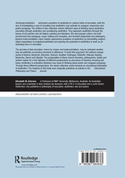 Activating Aesthetics addresses questions of aesthetics in various fields of education, with the aim of investigating a way of revealing how aesthetics may activate an engaged, responsive and poetic pedagogy. The writers in this collection enliven different ways of thinking about aesthetics, educating through aesthetics and questioning aesthetics. They approach aesthetics through the lenses of art practice and art history, painting and literature, film and popular culture, the built environment and pedagogy, music making and reception, and feminist subjectivity and philosophy. Beyond instrumentalism, each chapter approaches questions of aesthetics by dismantling subject-object separations of analytical aesthetics and opening the potential of aesthetics to work as an activating force in education. The premise is that education, driven by means-end instrumentalism, may be activated another way via aesthetic encounters premised in difference. To build this argument, the authors engage works of Adorno, Benjamin, Bourdieu, Deleuze, Guattari, Heidegger, Hölderlin, Hokusai, Irigaray, Nietzsche, Sterne and Stiegler. The juxtaposition of these diverse theorists, philosophers, artists and writers makes for a rich tapestry of different perspectives on processes of learning, knowing and being. Aesthetics in activation discloses new ways of thinking about poetic and engaged pedagogy. Through these different perspectives, the whole collection works towards an educational philosophy of aesthetics. The chapters in this book were originally published as articles in the Educational Philosophy and Theory journal.