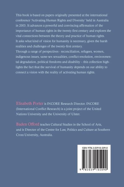 This book is based on papers originally presented at the international conference 'Activating Human Rights and Diversity' held in Australia in 2003. It advances a powerful and convincing affirmation of the importance of human rights in the twenty-first century and explores the vital connections between the theory and practice of human rights. It asks what kind of vision for humanity is necessary, given the harsh realities and challenges of the twenty-first century. Through a range of perspectives - reconciliation, refugees, women, indigenous issues, same-sex sexualities, conflict resolution, environmental degradation, political freedoms and disability - this collection highlights the fact that the survival of humanity depends on our ability to connect a vision with the reality of activating human rights.