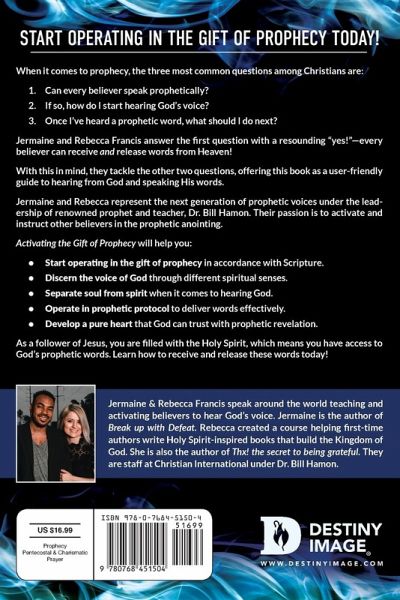 Start Operating in the Gift of Prophecy Today! When it comes to prophecy, the three most common questions among Christians are: Can every believer speak prophetically? If so, how do I start hearing God’s voice? Once I’ve heard a prophetic word, what should I do next? Jermaine and Rebecca Francis answer the first question with a resounding "yes!"—every believer can receive and release words from Heaven! With this in mind, they tackle the other two questions, offering this book as a user-friendly guide to hearing from God and speaking His words. Jermaine and Rebecca represent the next generation of prophetic voices under the leadership of renowned prophet and teacher, Dr. Bill Hamon. Their passion is to activate and instruct other believers in the prophetic anointing. Activating the Gift of Prophecy will help you: Start operating in the gift of prophecy in accordance with Scripture. Discern the voice of God through different spiritual senses. Separate soul from spirit when it comes to hearing God. Operate in prophetic protocol to deliver words effectively. Develop a pure heart that God can trust with prophetic revelation. As a follower of Jesus, you are filled with the Holy Spirit, which means you have access to God’s prophetic words. Learn how to receive and release these words today!