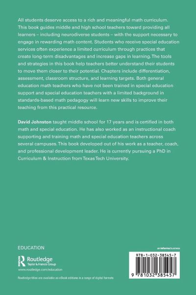 All students deserve access to a rich and meaningful math curriculum. This book guides middle and high school teachers toward providing all learners - including neurodiverse students - with the support necessary to engage in rewarding math content. Students who receive special education services often experience a limited curriculum through practices that create long-term disadvantages and increase gaps in learning. The tools and strategies in this book help teachers better understand their students to move them closer to their potential. Chapters include differentiation, assessment, classroom structure, and learning targets. Both general education math teachers who have not been trained in special education support and special education teachers with a limited background in standards-based math pedagogy will learn new skills to improve their teaching from this practical resource.