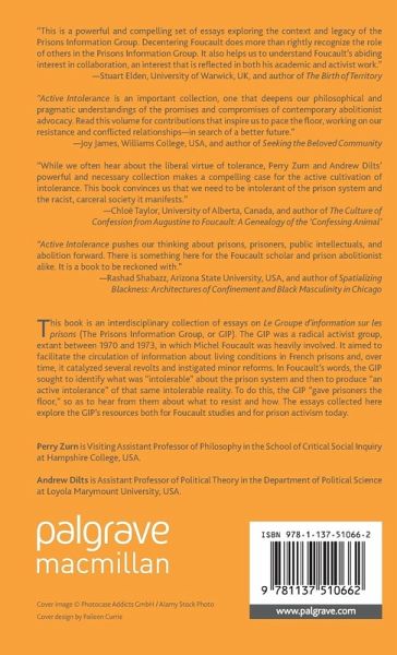 Table of Contents Foreword; Bernard Harcourt Acknowledgements List of Abbreviations Active Intolerance: An Introduction; Perry Zurn and Andrew Dilts PART I: HISTORY: THE GIP AND FOUCAULT IN CONTEXT 1. The Abolition of Philosophy; Ladelle McWhorter 2. The Untimely Speech of the GIP Counter-Archive; Lynne Huffer 3. Conduct and Power: Foucault ' 's Methodological Expansions in 1971; Colin Koopman 4. Work and Failure: Assessing the Prisons Information Group; Perry Zurn Intolerable 1: Abu Ali Abdur ' 'Rahman PART II: BODY: RESISTANCE AND THE POLITICS OF CARE 5. Breaking the Conditioning: The Relevance of the Prisons Information Group; Steve Champion (Adisa Kamara) 6. Between Discipline and Care-giving: Changing Prison Population Demographics and Possibilities for Self-Transformation; Dianna Taylor 7. Unruliness without Rioting: Hunger Strikes in Contemporary Politics; Falguni Sheth Intolerable 2: Derrick Quintero PART III: VOICE: PRISONERS AND THE PUBLIC INTELLECTUAL 8. Disrupted Foucault: Los Angeles ' ' Coalition Against Police Abuse (CAPA) and the Obsolescence of White Academic Raciality; Dylan Rodríguez 9. Investigations from Marx to Foucault; Marcelo Hoffman 10. The GIP as a Neoliberal Intervention: Trafficking in Illegible Concepts; Shannon Winnubst 11. The Disordering of Discourse: Voice and Authority in the GIP; Nancy Luxon Intolerable 3: Donald Middlebrooks PART IV: PRESENT: THE PRISON AND ITS FUTURE(S) 12. Beyond Guilt and Innocence: The Creaturely Politics of Prisoner Resistance Movements; Lisa Guenther 13. Resisting ' 'Massive Elimination ' ': Foucault, Immigration, and the GIP; Natalie Cisneros 14. ' 'Can They Ever Escape? ' ': Foucault, Black Feminism, and the Intimacy of Abolition; Stephen Dillon Notes on Contributors Index