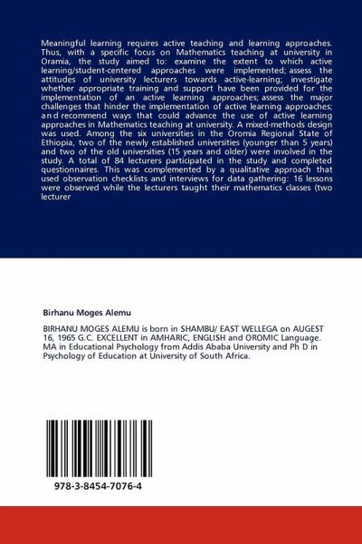 Meaningful learning requires active teaching and learning approaches. Thus, with a specific focus on Mathematics teaching at university in Oramia, the study aimed to: examine the extent to which active learning/student-centered approaches were implemented; assess the attitudes of university lecturers towards active-learning; investigate whether appropriate training and support have been provided for the implementation of an active learning approaches; assess the major challenges that hinder the implementation of active learning approaches; and recommend ways that could advance the use of active learning approaches in Mathematics teaching at university. A mixed-methods design was used. Among the six universities in the Oromia Regional State of Ethiopia, two of the newly established universities (younger than 5 years) and two of the old universities (15 years and older) were involved in the study. A total of 84 lecturers participated in the study and completed questionnaires. This was complemented by a qualitative approach that used observation checklists and interviews for data gathering: 16 lessons were observed while the lecturers taught their mathematics classes (two lecturer