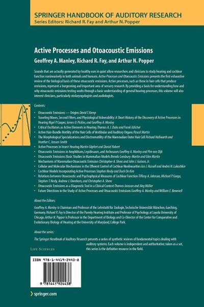 Otoacoustic Emissions: Concepts and Origins.- Traveling Waves, Second Filters, and Physiological Vulnerability: A Short History of the Discovery of Active Processes in Hearing.- Critical Oscillators as Active Elements in Hearing.- Active Hair-Bundle Motility of the Hair Cells of Vestibular and Auditory Organs.- The Morphological Specializations and Electromotility of the Mammalian Outer Hair Cell.- Active Processes in Insect Hearing.- Otoacoustic Emissions in Amphibians, Lepidosaurs, and Archosaurs.- Otoacoustic Emissions: Basic Studies in Mammalian Models.- Mechanisms of Mammalian Otoacoustic Emission.- Cellular and Molecular Mechanisms in the Efferent Control of Cochlear Nonlinearities.- Cochlear Models Incorporating Active Processes.- Relationships Between Otoacoustic and Psychophysical Measures of Cochlear Function.- Otoacoustic Emissions as a Diagnostic Tool in a Clinical Context.- Future Directions in the Study of Active Processes and Otoacoustic Emissions.