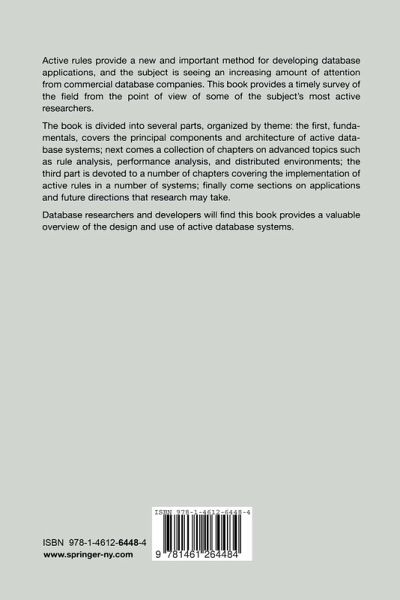Active rules provide a new and important method for designing databases and the subject is seeing an increasing amount of attention from commercial database companies. This book provides a timely survey of the field from the point of view of some of the subject's most active researchers. The book is divided into several parts, organized by theme: the first, Fundamentals covers the underlying methodology reagrding active rules, next comes a collection of chapters which cover formal specification, rule analysis, performance analysis, and support tools, the third part is devoted to a number of chapters covering the implementation of active rules in a number of commercial systems. Finally, come sections on applications and future directions that research may take. All researchers in databases will find this provides a valuable overview of this topic.