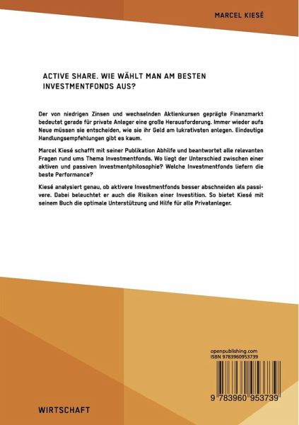 Der von niedrigen Zinsen und wechselnden Aktienkursen geprägte Finanzmarkt bedeutet gerade für private Anleger eine große Herausforderung. Immer wieder aufs Neue müssen sie entscheiden, wie sie ihr Geld am lukrativsten anlegen. Eindeutige Handlungsempfehlungen gibt es kaum.Marcel Kiesé schafft mit seiner Publikation Abhilfe und beantwortet alle relevanten Fragen rund ums Thema Investmentfonds. Wo liegt der Unterschied zwischen einer aktiven und passiven Investmentphilosophie? Welche Investmentfonds liefern die beste Performance?Kiesé analysiert genau, ob aktivere Investmentfonds besser abschneiden als passivere. Dabei beleuchtet er auch die Risiken einer Investition. So bietet Kiesé mit seinem Buch die optimale Unterstützung und Hilfe für alle Privatanleger.Aus dem Inhalt:-Fonds;-Privatanleger;-Geldanlage;-Active Share;-Tracking Error;-Aktives Management