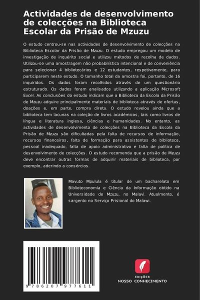 O estudo centrou-se nas actividades de desenvolvimento de colecções na Biblioteca Escolar da Prisão de Mzuzu. O estudo empregou um modelo de investigação de inquérito social e utilizou métodos de recolha de dados. Utilizou-se uma amostragem não probabilística intencional e de conveniência para selecionar 4 bibliotecários e 12 estudantes, respetivamente, para participarem neste estudo. O tamanho total da amostra foi, portanto, de 16 inquiridos. Os dados foram recolhidos através de um questionário estruturado. Os dados foram analisados utilizando a aplicação Microsoft Excel. As conclusões do estudo indicam que a Biblioteca da Escola da Prisão de Mzuzu adquire principalmente materiais de biblioteca através de ofertas, doações e, em parte, compra direta. O estudo revelou ainda que a biblioteca tem lacunas na coleção de livros académicos, tais como livros de língua e literatura inglesa, ciências e humanidades. No entanto, as actividades de desenvolvimento de colecções na Biblioteca da Escola da Prisão de Mzuzu são dificultadas pela falta de recursos de informação, recursos financeiros, falta de formação para assistentes de biblioteca, pessoal inadequado, falta de apoio administrativo e falta de política de desenvolvimento de colecções. O estudo recomenda que a prisão de Mzuzu deve encontrar outras formas de adquirir materiais de biblioteca, por exemplo, aderindo a consórcios.