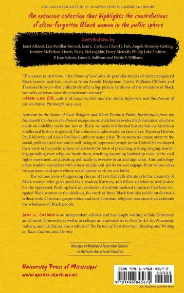 Contributions by Janet Allured, Lisa Pertillar Brevard, Jami L. Carlacio, Cheryl J. Fish, Angela Hornsby-Gutting, Jennifer McFarlane-Harris, Neely McLaughlin, Darcy Metcalfe, Phillip Luke Sinitiere, P. Jane Splawn, Laura L. Sullivan, and Hettie V. Williams Activism in the Name of God: Religion and Black Feminist Public Intellectuals from the Nineteenth Century to the Present recognizes and celebrates twelve Black feminists who have made an indelible mark not just on Black women's intellectual history but on American intellectual history in general. The volume includes essays on Jarena Lee, Theressa Hoover, Pauli Murray, and Alexis Pauline Gumbs, to name a few. These women's commitment to the social, political, and economic well-being of oppressed people in the United States shaped their work in the public sphere, which took the form of preaching, writing, singing, marching, presiding over religious institutions, teaching, assuming leadership roles in the civil rights movement, and creating politically subversive print and digital art. This anthology offers readers exemplars with whose minds and spirits we can engage, from whose ideas we can learn, and upon whose social justice work we can build. The volume joins a burgeoning chorus of texts that calls attention to the creativity of Black women who galvanized their readers, listeners, and fellow activists to seek justice for the oppressed. Pushing back on centuries of institutionalized injustices that have relegated Black women to the sidelines, the work of these Black feminist public intellectuals reflects both Christian gospel ethics and non-Christian religious traditions that celebrate the wholeness of Black people.