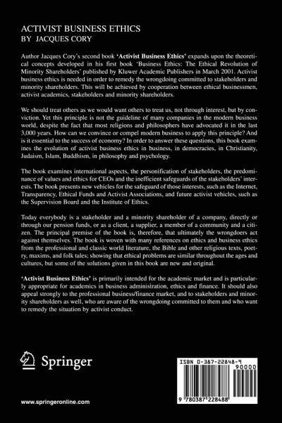 "The truth can wait, for it lives a long life" (Arthur Schopenhauer, German philosopher, 1788-1860) The philosopher Schopenhauer believed in the eventual triumph of truth, despite the disappointments engendered by his indifferent contemporaries. Two centuries later, we live in a time of accelerated changes, and we do not have the long life to wait for the truth. Activist business ethics, business ethics with a more activist militant approach, is needed in order to remedy the wrongdoing committed to the stakeholders and minority shareholders. This will be achieved by cooperation between ethical businessmen and businesswomen, activist academics and associations of stakeholders and minority shareholders. We should treat others as we would want them to treat us, not through interest, but by conviction. Yet this principle is not the guideline of many companies in the modern business world, although most of religions and philosophers have preconized it in the last 3,000 years. How could we convince or compel modern business to apply this principle and is it essential to the success of economy? In order to answer these questions this book examines the evolution of activist business ethics in business, democracies, Christianity, Judaism, Islam, Buddhism and other religions, as well as in philosophy, psychology and psychoanalysis. The book examines international aspects, the personification of stakeholders, the predominance of values and ethics for CEOs and the inefficient safeguards of the stakeholders' interests.