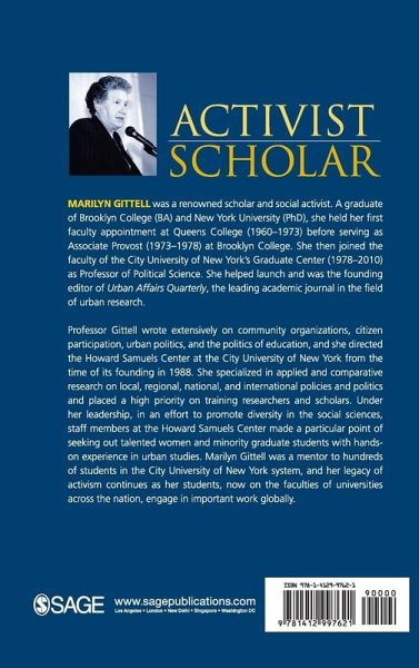 Activist Scholar: Selected Works of Marilyn Gittell features seminal writings by Marilyn Gittell, a preface by Sara Miller McCune (Founder and Executive Chairman, SAGE Publications), a general introduction by Ross Gittell and Kathe Newman, and part introductions by Ross Gittell, Kathe Newman, Maurice Berube, and Nancy Naples. The part introductions highlight the key areas of research Marilyn Gittell championed and provide insightful context for the articles that follow. In addition to exploring Marilyn Gittell's groundbreaking research, this book serves as a bridge to current and future community-based urban research that advances citizen participation and empowerment.Marilyn Gittell was a renowned scholar and social activist. A graduate of Brooklyn College (BA) and New York University (PhD), she held her first faculty appointment at Queens College (1960-1973) before serving as Associate Provost (1973-1978) at Brooklyn College. She then joined the faculty of the City University of New York's Graduate Center (1978-2010) as Professor of Political Science. She helped launch and was the founding editor of Urban Affairs Quarterly, the leading academic journal in the field of urban research.Activist Scholar highlights Professor Gittell's writings on community organizations, citizen participation, urban politics, the politics of education, and gender. She specialized in applied and comparative research on local, regional, national, and international policies and politics, and placed a high priority on training researchers and scholars. Marilyn Gittell was a mentor to hundreds of students in the City University of New York system, and her legacy of activism continues as her students, now on the faculties of universities across the nation, engage in important work globally.