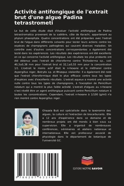 Le but de cette étude était d'évaluer l'activité antifongique de Padina tetrastromatica provenant de la sablière, côte de Karachi, appartenant au phylum phaeophyta. Quatre concentrations ont été préparées avec l'extrait brut de l'algue dans différents solvants pour tester leurs actions contre les espèces de champignons pathogènes qui causent diverses maladies. Un contrôle avec d'autres concentrations correspondantes a également été testé dans les expériences. Les résultats des expériences ont été excellents en ce qui concerne l'activité antifongique. Les résultats les plus probants ont été obtenus avec l'extrait de chloroforme contre Trichoderma sp., soit 40,3±0,38 mm pour l'extrait brut et 32,1±0,55 mm pour la concentration 1/1. L'extrait le moins actif était le n-hexane et le méthanol contre Aspergillus niger, Botrytis sp. et Rhizopus stolonifer. Il a également été noté que l'extrait chloroformique était le plus efficace contre tous les types d'espèces avec d'excellents résultats. L'extrait aqueux a montré une activité nulle contre tous les types de champignons, à l'exception de Penicillium notatum qui a montré la plus faible activité. L'extrait d'algues au n-hexane s'est révélé être un agent antifongique puissant contre Penicillium notatum à toutes les concentrations. Cependant, l'extrait n-hexane à 1/100 (g/ml) n'a rien montré contre Aspergillus niger.