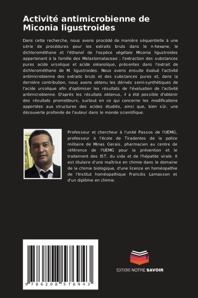 Dans cette recherche, nous avons procédé de manière séquentielle à une série de procédures pour les extraits bruts dans le n-hexane, le dichlorométhane et l'éthanol de l'espèce végétale Miconia ligustroides appartenant à la famille des Melastomataceae ; l'extraction des substances pures acide ursolique et acide oléanoïque, présentes dans l'extrait de dichlorométhane de M. ligustroides. Nous avons ensuite évalué l'activité antimicrobienne des extraits bruts et des substances pures et, dans la dernière contribution, nous avons obtenu les dérivés semi-synthétiques de l'acide ursolique afin d'optimiser les résultats de l'évaluation de l'activité antimicrobienne. D'après les résultats obtenus, il a été possible d'obtenir des résultats prometteurs, surtout en ce qui concerne les modifications apportées aux structures des acides étudiés, ainsi que, bien sûr, une découverte profonde de l'auteur dans le monde scientifique.
