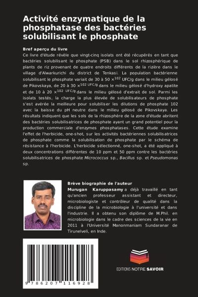 Bref aperçu du livreCe livre d'étude révèle que vingt-cinq isolats ont été récupérés en tant que bactéries solubilisant le phosphate (PSB) dans le sol rhizosphérique de plants de riz provenant de quatre endroits différents de la rizière dans le village d'Alwarkurichi du district de Tenkasi. La population bactérienne solubilisant le phosphate variait de 30 à 50 ×102 UFC/g dans le milieu gélosé de Pikovskaya, de 20 à 30 ×102 UFC/g dans le milieu gélosé d'hydroxy apatite et de 10 à 20 ×102 UFC/g dans le milieu gélosé d'extrait de sol. Parmi les isolats testés, la charge la plus élevée de solubilisateurs de phosphate s'est avérée la meilleure pour solubiliser les dilutions de phosphate 102 avec la baisse du pH neutre dans le milieu gélosé de Pikovskaya. Les résultats indiquent que les sols de la rhizosphère de la zone d'étude abritent des bactéries solubilisatrices de phosphate ayant un grand potentiel pour la production commerciale d'enzymes phosphatases. Cette étude examine l'effet de l'herbicide, one-shot, sur les activités bactériennes solubilisatrices de phosphate comme la solubilisation de phosphate par le schéma de résistance à l'herbicide. L'herbicide sélectionné, one-shot, a été appliqué à deux concentrations différentes de 10 ppm et 50 ppm contre les bactéries solubilisatrices de phosphate Micrococcus sp., Bacillus sp. et Pseudomonas sp.