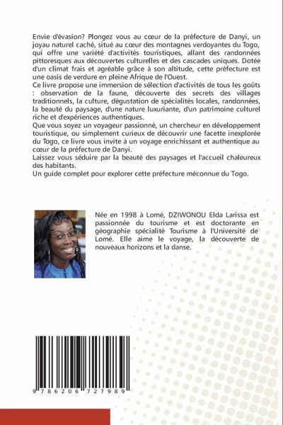 Envie d'évasion? Plongez vous au coeur de la préfecture de Danyi, un joyau naturel caché, situé au coeur des montagnes verdoyantes du Togo, qui offre une variété d'activités touristiques, allant des randonnées pittoresques aux découvertes culturelles et des cascades uniques. Dotée d'un climat frais et agréable grâce à son altitude, cette préfecture est une oasis de verdure en pleine Afrique de l'Ouest.Ce livre propose une immersion de sélection d'activités de tous les goûts : observation de la faune, découverte des secrets des villages traditionnels, la culture, dégustation de spécialités locales, randonnées, la beauté du paysage, d'une nature luxuriante, d'un patrimoine culturel riche et d'expériences authentiques. Que vous soyez un voyageur passionné, un chercheur en développement touristique, ou simplement curieux de découvrir une facette inexplorée du Togo, ce livre vous invite à un voyage enrichissant et authentique au coeur de la préfecture de Danyi.Laissez vous séduire par la beauté des paysages et l'accueil chaleureux des habitants.Un guide complet pour explorer cette préfecture méconnue du Togo.