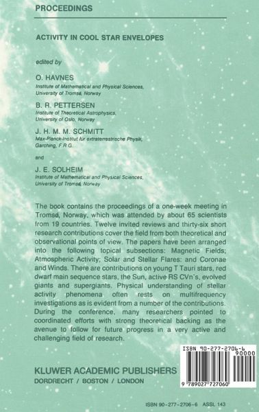 I. Magnetic Fields.- Stellar Magnetic Fields, Origin and Structure.- Observational Constraints for Solar-Type Dynamos.- The Development of Structure in Coronal Magnetic Fields.- Stellar magnetic fields: measurements and diagnostics.- A new technique for the measurement of stellar magnetic fields: First Results.- Multiwavelength observations of magnetic fields and related activity on XI Bootis A.- II. Atmospheric Activity.- Atmospheric Activity in the outer envelopes of cool dwarf stars.- Radiation losses in chromospheric and transition region emission lines from AD Leo (dM4e).- Variation of the flare energy spectrum during the activity cycle of the UV CET-TYPE stars.- Statistical photometry of flare stars in the ultraviolet and photographic bands.- Photographic photometry and'statistical investigation of Pleiades flare stars.- B-19-A flare star in front of the NGC 7000 aggregate.- IRAS observations of flare stars.- Spectroscopic observations of X-ray selected late type stars.- Activity in envelopes of T Tauri Stars.- RY Lupi-A pulsating T Tauri Star?.- Deuterium burning and pulsational instabilities in pre-main-sequence stars.- Small scale stellar surface structures.- Visible and infrared photometry of ER Val.- Spot activity and circumstellar matter in II Peg.- III. Stellar and Solar Flares.- Magnetic reconnection models of flares.- Conditions for transition from quiescent to active states in stellar atmospheres.- Stellar and solar flares: Some theoretical problems from the point of view of modern observations.- Quasi-static evolution of a force-free magnetic field - Applications to the theory of stellar flares and coronal heating.- Flares: Magnetic or convective origin?.- Simultaneous optical and infrared observations of stellar flares.- Coordinated photometry,spectroscopy and X-ray observations of flare stars.- Modeling of long-decay stellar flares on EQ Peg and Prox Cen.- Spatially resolved flares in RSCVn Systems.- Simultaneous EXOSAT and VLA observations of the W UMa binaries VW Cep and XY Leo: A Flare on VW Cep.- IV. Stellar Coronae and Winds.- Models of Solar-type coronae.- Acceleration of energetic particles in solar flares.- Effect of a dense coronal region on line observations from coronal holes.- Dynamic Nature of coronal heating.- Stellar X-ray astronomy with ROSAT.- Observing Cool Stars with the XUV wide field camera on ROSAT.- On solar and stellar coronal models.- EXOSAT observations of RSCVn stars.- Densities and heating of coronae of the active late-type dwarfs.- EXOSAT observations of quiescent and flaring emission from M dwarf flare stars.- X-ray variability of dM stars observed by EXOSAT.- Stellar Radio Emission.- Radio Emission Processes Related to Solar Flares.- Properties of Stellar Magnetospheres Deduced from Radio Observations of Close Binaries.- VLA observations of the X-ray bright Hyades M-dwarfs.- Radio Emission from Active Young Stars in the RHO OPHIUCHI CLOUD.- Mass Loss Mechanisms for Cool Stars.- Winds in Cool Stars.- The Ultraviolet Variability of Betelgeuse.- Envelope Activity of the K-Type Supergiant HD 4817.- Helium Lines Formation in T-Tauri Stars.- (X-ray observations of solar flares.- Name Index.- Object Index.