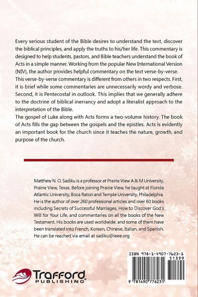 Every serious student of the Bible desires to understand the text, discover the biblical principles, and apply the truths to his/her life. This commentary is designed to help students, pastors, and Bible teachers understand the book of Acts in a simple manner. Working from the popular New International Version (NIV), the author provides helpful commentary on the text verse-by-verse. This verse-by-verse commentary is different from others in two respects. First, it is brief while some commentaries are unnecessarily wordy and verbose. Second, it is Pentecostal in outlook. This implies that we generally adhere to the doctrine of biblical inerrancy and adopt a literalist approach to the interpretation of the Bible. The gospel of Luke along with Acts forms a two-volume history. The book of Acts fills the gap between the gospels and the epistles. Acts is evidently an important book for the church since it teaches the nature, growth, and purpose of the church.
