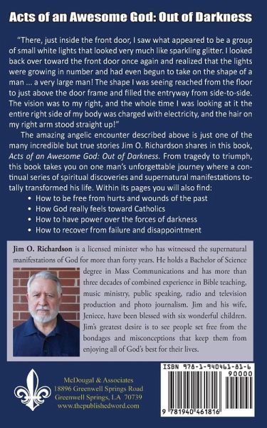 "There, just inside the front door, I saw what appeared to be a group of small white lights that looked very much like sparkling glitter. "I looked back over toward the front door once again, I realized the lights were growing in number and had even begun to take on the shape of a man ... a very large man! "The shape I was seeing reached from the floor to just above the door frame and filled the entryway from side-to-side. "The vision was to my right, and the whole time I was looking at it the entire right side of my body was charged with electricity, and the hair on my right arm stood straight up!" The amazing angelic encounter described above is just one of the many incredible but true stories Jim O. Richardson shares in this book, Acts of an Awesome God: Out of Darkness. From tragedy to triumph, this book takes you on one man's unforgettable journey where a continual series of spiritual discoveries and supernatural manifestations totally transformed his life. Within its pages you will also find: How to be free from hurts and wounds of the past How God really feels toward Catholics How to have power over the forces of darkness How to recover from failure and disappointment
