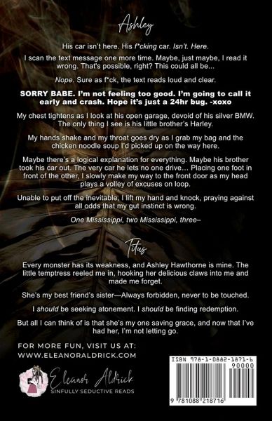 ASHLEY His car isn't here. His f*cking car. Isn't. Here. I scan the text message one more time. Maybe, just maybe, I read it wrong. That's possible, right? This could all be... Nope. Sure as f*ck, the text reads loud and clear. SORRY BABE. I'm not feeling too good. I'm going to call it early and crash. Hope it's just a 24hr bug. -xoxo My chest tightens as I look at his open garage, devoid of his silver BMW. The only thing I see is his little brother's Harley. My hands shake and my throat goes dry as I grab my bag and the chicken noodle soup I'd picked up on the way here. Maybe there's a logical explanation for everything. Maybe his brother took his car out. The very car he lets no one drive... Placing one foot in front of the other, I slowly make my way to the front door as my head plays a volley of excuses on loop. Unable to put off the inevitable, I lift my hand and knock, praying against all odds that my gut instinct is wrong. One Mississippi, two Mississippi, three- TITUS Every monster has its weakness, and Ashley Hawthorne is mine. The little temptress reeled me in, hooking her delicious claws into me and made me forget. She's my best friend's sister-Always forbidden, never to be touched. I should be seeking atonement. I should be finding redemption. But all I can think of is that she's my one saving grace, and now that I've had her, I'm not letting go.