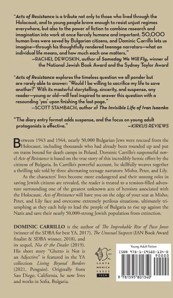 Between 1943 and 1944, nearly 50,000 Bulgarian Jews were rescued from the Holocaust, including thousands who had already been rounded up and put on trains bound for death camps in Poland. Dominic Carrillo’s suspenseful novel Acts of Resistance is based on the true story of this incredibly heroic effort by the citizens of Bulgaria. In Carrillo’s powerful account, he skillfully weaves together a thrilling tale told by three alternating teenage narrators: Misho, Peter, and Lily. Misho, an 18-year-old Jewish boy, is a prominent archbishop’s driver, hiding his identity while helping his boss directly challenge the Bulgarian government’s pro-Nazi policies. Peter, 17, is determined to save his Jewish neighbors by confronting parliament members in the capital, then taking up arms to fight with a partisan rebel communist group. Lily, 19, works for the collaborationist government office in charge of evicting and deporting Jews to concentration camps. When she witnesses the evil results of her desk job, Lily becomes a spy who leaks information to Jewish community leaders in order to prevent further atrocities. As the characters’ lives become more endangered and their unsung roles in saving Jewish citizens are revealed, the reader is treated to a tension-filled adventure surrounding one of the greatest unknown acts of heroism associated with the Holocaust. Acts of Resistance will have you on the edge of your seat as Misho, Peter, and Lily face and overcome extremely perilous situations, ultimately triumphing as they each help to lead the people of Bulgaria to rise up against the Nazis and save their nearly 50,000-strong Jewish population from extinction.