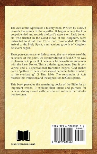 The Acts of the Apostles is a history book. Written by Luke, it records the events of the apostles. It begins where the four gospels ended and records the Lord's Ascension. Early believers who trusted in the Good News of the Kingdom, were instructed to do all that Christ had commanded. With the arrival of the Holy Spirit, a miraculous growth of Kingdom Believers began. Then, persecution came. It threatened the very existence of the believers. At this point, we are introduced to Saul. On his way to Damascus in pursuit of believers, he has a divine encounter with the Risen Savior. This is a defining moment: Saul is converted and a dispensational transition begins. God makes Paul a "pattern to them which should hereafter believe on him to life everlasting" (1 Tim. 1:16). The remainder of Acts records this transition and the opposition to God's plans. This book precedes the remaining books of the Bible for an important reason. It explains their intent and purpose for believers today as well as those who will suffer in the Tribulation to come.
