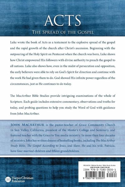 Riots. Intolerance. Accusations. Scandal. Beatings. Plots. Arrests. Executions. Murder...And out of that, the Church was born. Pastor John MacArthur will take you through the story of the earliest Christian movement to show how--even in the midst of persecution and opposition--the early believers were able to rely on God's spirit for direction and divine authority to preach the gospel to all nations. The book of Acts is a carefully-recorded history of the explosive spread of the gospel and the rapid growth of the church after Christ's ascension. In one of the most tumultuous, violent and dramatic books in the entire Bible, Acts starts with the outpouring of the Holy Spirit, without which the young church could never have survived the unleashing of rage and prejudice towards these radical followers of The Way. Throughout Acts, God shows His infinite power regardless of the circumstances, just as He continues to do today. --ABOUT THE SERIES-- The MacArthur Bible Study series is designed to help you study the Word of God with guidance from widely respected pastor and author John MacArthur. Each guide provides intriguing examinations of the whole of Scripture by examining its parts and incorporates: Extensive, but straight-forward commentary on the text. Detailed observations on overriding themes, timelines, history, and context. Word and phrase studies to help you unlock the broader meaning and apply it to your life. Probing, interactive questions with plenty of space to write down your response and thoughts.