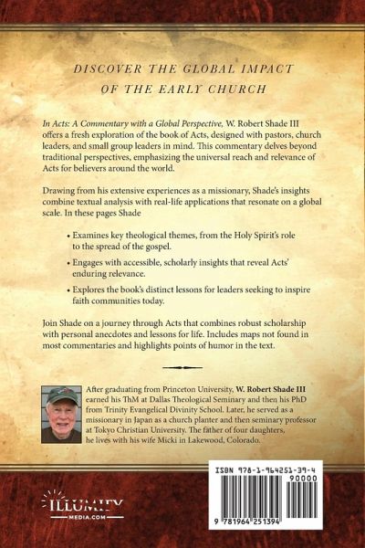Discover the Global Impact of the Early Church In Acts: A Commentary with a Global Perspective, W. Robert Shade III offers a fresh exploration of the book of Acts, designed with pastors, church leaders, and small group leaders in mind. This commentary delves beyond traditional perspectives, emphasizing the universal reach and relevance of Acts for believers around the world. Drawing from his extensive experiences as a missionary, Shade's insights combine textual analysis with real-life applications that resonate on a global scale. In these pages Shade Examines key theological themes, from the Holy Spirit's role to the spread of the gospel. Engages with accessible, scholarly insights that reveal Acts' enduring relevance. Explores the book's distinct lessons for leaders seeking to inspire faith communities today. Join Shade on a journey through Acts that combines robust scholarship with personal anecdotes and lessons for life. Includes maps not found in most commentaries and highlights points of humor in the text.
