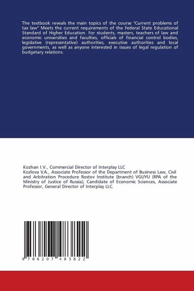 The textbook reveals the main topics of the course "Current problems of tax law" Meets the current requirements of the Federal State Educational Standard of Higher Education. For students, masters, teachers of law and economic universities and faculties, officials of financial control bodies, legislative (representative) authorities, executive authorities and local governments, as well as anyone interested in issues of legal regulation of budgetary relations.