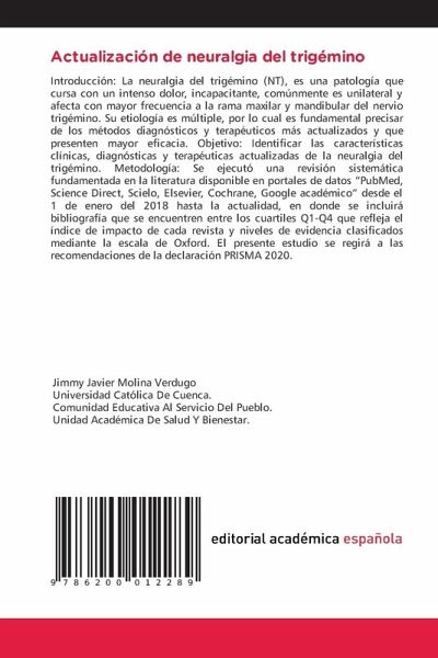 Introducción: La neuralgia del trigémino (NT), es una patología que cursa con un intenso dolor, incapacitante, comúnmente es unilateral y afecta con mayor frecuencia a la rama maxilar y mandibular del nervio trigémino. Su etiología es múltiple, por lo cual es fundamental precisar de los métodos diagnósticos y terapéuticos más actualizados y que presenten mayor eficacia. Objetivo: Identificar las características clínicas, diagnósticas y terapéuticas actualizadas de la neuralgia del trigémino. Metodología: Se ejecutó una revisión sistemática fundamentada en la literatura disponible en portales de datos "PubMed, Science Direct, Scielo, Elsevier, Cochrane, Google académico" desde el 1 de enero del 2018 hasta la actualidad, en donde se incluirá bibliografía que se encuentren entre los cuartiles Q1-Q4 que refleja el índice de impacto de cada revista y niveles de evidencia clasificados mediante la escala de Oxford. El presente estudio se regirá a las recomendaciones de la declaración PRISMA 2020.
