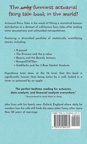 The only, I mean, funniest actuarial fairy tale book in the world! Actuarial Fairy Tales is the result of fitting a statistical humour distribution to a dataset of well-known fairy tales after making some assumptions and unfounded extrapolations. Featuring a diversified portfolio of statistically scintillating stories, including:R-punzel The Princess and the p-value Beauty and the Beastly Actuary RumpelSTATSkin Goldilocks and the 3 Bear Market Analysts Hypothesis tests show, at the 1% level, that this book is significantly funnier than being eaten by a wolf, locked in a tower or poisoned by an apple. The perfect bedtime reading for actuaries, data analysts, and financial analysts everywhere.* *Guaranteed to send them to sleep.