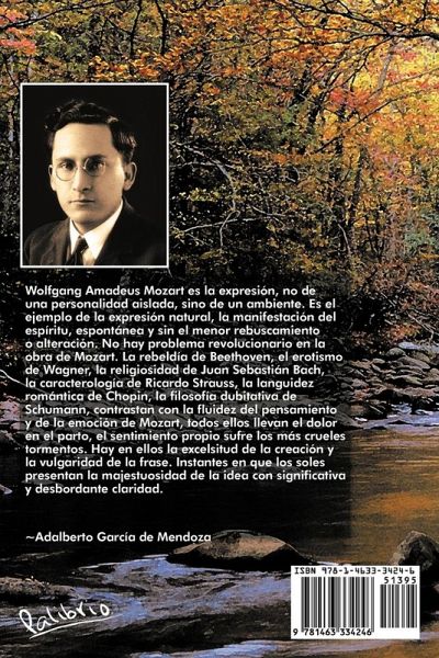 Wolfgang Amadeus Mozart es la expresión, no de una personalidad aislada, sino de un ambiente. Es el ejemplo de la expresión natural, la manifestación del espíritu, espontánea y sin el menor rebuscamiento o alteración. No hay problema revolucionario en la obra de Mozart. La rebeldía de Beethoven, el erotismo de Wagner, la religiosidad de Juan Sebastián Bach, la caracterología de Ricardo Strauss, la languidez romántica de Chopin, la filosofía dubitativa de Schumann, contrastan con la fluidez del pensamiento y de la emoción de Mozart, todos ellos llevan el dolor en el parto, el sentimiento propio sufre los más crueles tormentos. Hay en ellos la excelsitud de la creación y la vulgaridad de la frase. Instantes en que los soles presentan la majestuosidad de la idea con significativa y desbordante claridad. ~Adalberto García de Mendoza