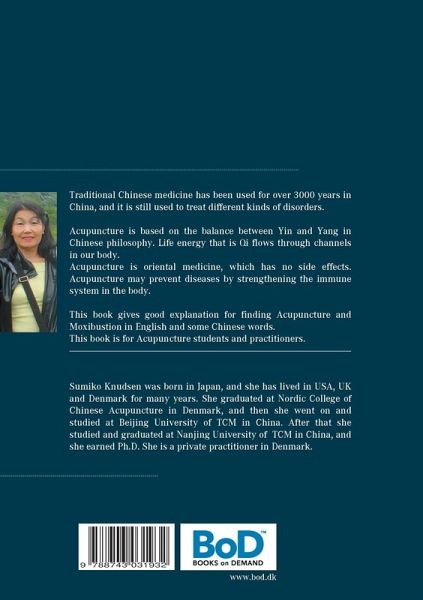 Traditional Chinese medicine has been used for over 3000 years in China, and it is still used to treat different kinds of disorders.Acupuncture is based on the balance between Yin and Yang in Chinese philosophy. Life energy that is Qi flows through channels in our body. Acupuncture is oriental medicine, which has no side effects. Acupuncture may prevent diseases by strengthening the immune system in the body. This book gives good explanation for finding Acupuncture and Moxibustion in English and some Chinese words. This book is for Acupuncture students and practitioners.