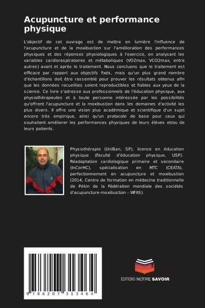 L'objectif de cet ouvrage est de mettre en lumière l'influence de l'acupuncture et de la moxibustion sur l'amélioration des performances physiques et des réponses physiologiques à l'exercice, en analysant les variables cardiorespiratoires et métaboliques (VO2max, VCO2max, entre autres) avant et après le traitement. Nous concluons que le traitement est efficace par rapport aux objectifs fixés, mais qu'un plus grand nombre d'échantillons doit être rassemblé pour prouver les résultats obtenus afin que les données recueillies soient reproductibles et fiables aux yeux de la science. Ce livre s'adresse aux professionnels de l'éducation physique, aux physiothérapeutes et à toute personne intéressée par les possibilités qu'offrent l'acupuncture et la moxibustion dans les domaines d'activité les plus divers. Il offre une vision plus académique et scientifique d'un sujet encore très empirique, ainsi qu'un protocole de base pour ceux qui souhaitent améliorer les performances physiques de leurs élèves et/ou de leurs patients.