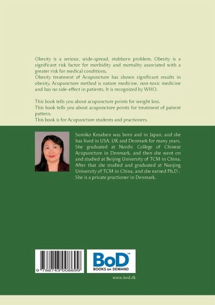 Obesity is a serious, wide-spread, stubborn problem. It's a significant risk factor for morbidity and mortality associated with a greater risk for medical conditions.Obesity treatment of Acupuncture has shown significant results in obesity. Acupuncture method is nature medicine, non-toxic medicine and has no side-effect in patients. It is recognized by WHO. This book tells you about acupuncture points for weight loss.This book tells you about acupuncture points for treatment of patient pattern. This book is for Acupuncture students and practioners.