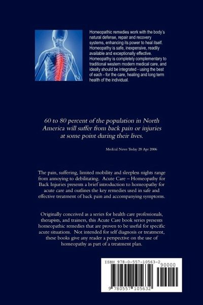 60 to 80 percent of the population in North America will suffer from back pain or injuries at some point during their lives. The pain, suffering, limited mobility and sleepless nights range from annoying to debilitating. Acute Care - Homeopathy for Back Injuries presents a brief introduction to homeopathy for acute care and outlines the key remedies used in safe and effective treatment of back pain and accompanying symptoms. Originally conceived as a series for health care professionals, therapists, and trainers, this Acute Care book series presents homeopathic remedies that are proven to be useful for specific acute situations. Not intended for self diagnosis or treatment, these books give any reader a perspective on the use of homeopathy as part of a treatment plan.
