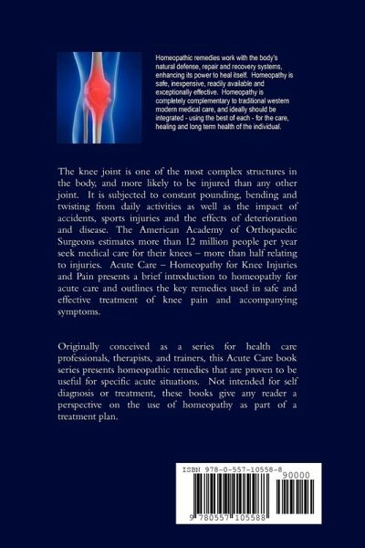 The knee joint is one of the most complex structures in the body, and more likely to be injured than any other joint. It is subjected to constant pounding, bending and twisting from daily activities as well as the impact of accidents, sports injuries and the effects of deterioration and disease. More than 12 million people per year seek medical care for their knees - more than half relating to injuries. Acute Care - Homeopathy for Knee Injuries and Pain presents a brief introduction to homeopathy for acute care and outlines the key remedies used in safe and effective treatment of knee pain and accompanying symptoms. Originally conceived as a series for health care professionals, therapists, and trainers, this Acute Care book series presents homeopathic remedies that are proven to be useful for specific acute situations.