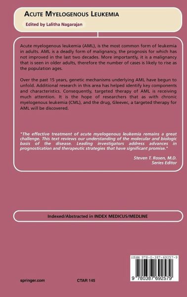 The Leukemia Stem Cell.- Epigenetic Mechanisms in AML - A Target for Therapy.- Chromosomal Translocations in AML: Detection and Prognostic Significance.- Chromosomal Deletions in AML.- Genes Predictive of Outcome and Novel Molecular Classification Schemes in Adult Acute Myeloid Leukemia.- Receptor Tyrosine Kinase Alterations in AML - Biology and Therapy.- Lineage-Specific Transcription Factor Aberrations in AML.- Proleukemic RUNX1 and CBF? Mutations in the Pathogenesis of Acute Leukemia.- Acute Myeloid Leukemia with Mutated Nucleophosmin (NPM1): Molecular, Pathological, and Clinical Features.- MicroRNAs: New Players in AML Pathogenesis.- Murine Models of Human Acute Myeloid Leukemia.- Apoptosis in Leukemias: Regulation and Therapeutic Targeting.- Acute Promyelocytic Leukemia: A Paradigm for Differentiation Therapy.- Immunotherapy of AML.- Therapy of Acute Myelogenous Leukemia in Adults.