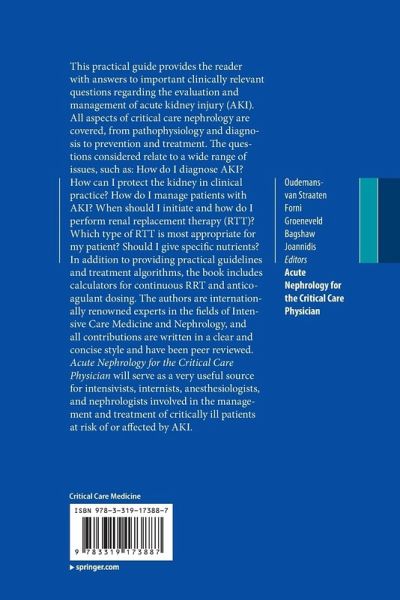 This practical guide provides the reader with answers to important clinically relevant questions regarding the evaluation and management of acute kidney injury (AKI). All aspects of critical care nephrology are covered, from pathophysiology and diagnosis to prevention and treatment. The questions considered relate to a wide range of issues, such as: How do I diagnose AKI? How can I protect the kidney in clinical practice? How do I manage patients with AKI? When should I initiate and how do I perform renal replacement therapy (RTT)? Which type of RTT is most appropriate for my patient? Should I give specific nutrients? In addition to providing practical guidelines and treatment algorithms, the book includes calculators for continuous RRT and anticoagulant dosing. The authors are internationally renowned experts in the fields of Intensive Care Medicine and Nephrology and all contributions are written in a clear and concise style and have been peer reviewed. Acute Nephrology for theCritical Care Physician will serve as a very useful source for intensivist internists, anesthesiologists and nephrologists involved in the management and treatment of critically ill patients at risk of or affected by AKI.